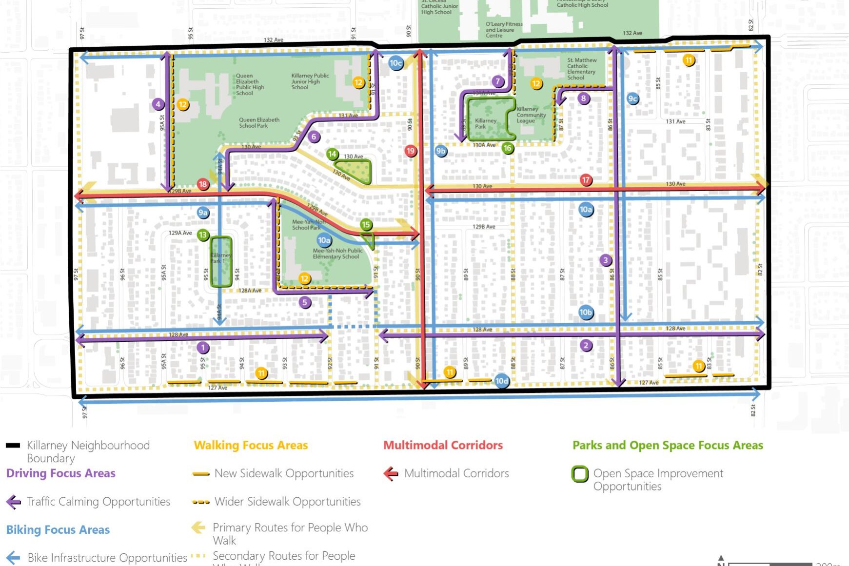 Key project tasks included the design and delivery of extensive public consultation initiatives, analysis of various interrelated networks, identification of gaps, opportunities, and focus areas, preparation of an urban design framework, and development of concepts for implementation. Our approach to analysis put a strong emphasis on local issues including traffic, connectivity, lighting, safety, placemaking, and open spaces. Special emphasis was placed on empowering communities and incorporating their input into the preferred concepts.